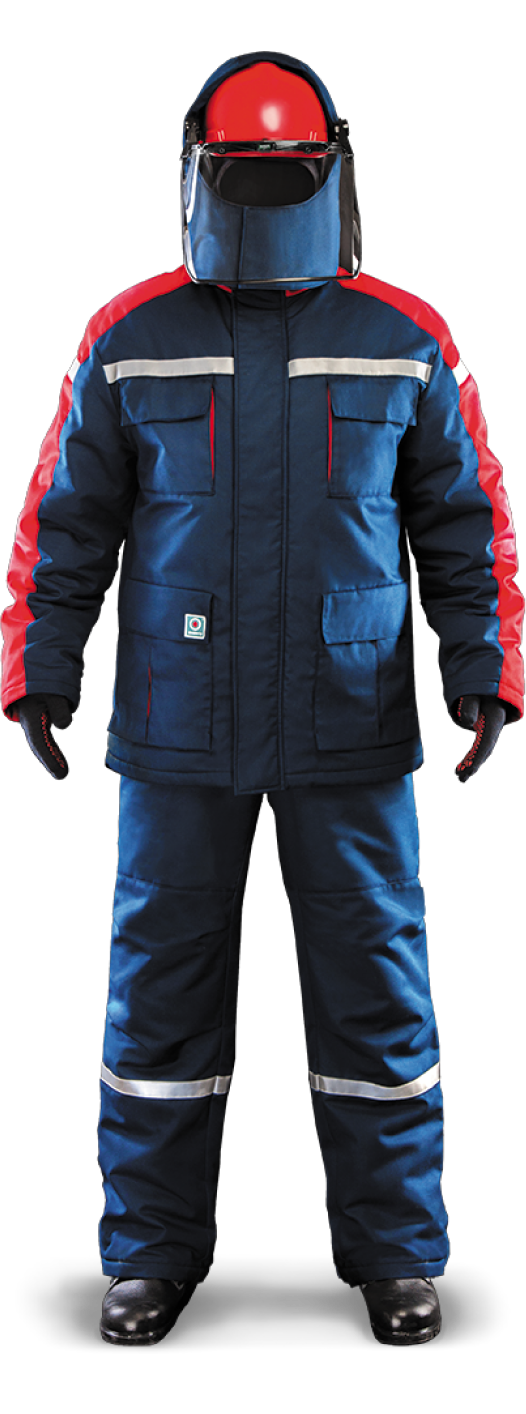 Костюм (куртка с капюшоном, брюки) для защиты от термических рисков электрической дуги со значением падающей энергии (ЗЭТВ) до 55,0 кал/см2 (5 уровень защиты); общих производственных загрязнений и механических воздействий (истирания); пониженных температур (1-2 класс защиты) для эксплуатации в I-II, III климатических поясах из термостойкой антиэлектростатической ткани Термол® 220 МВО с маслонефтеводоотталкивающей отделкой, модель Т/з-8Т ЭНЕРГО Рекорд 220